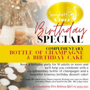 Always a great atmosphere at this prize of Robina. Entertainment, including dancing is a fave. Meal options, well prepared and great tasting are guaranteed. Well done to the team @ Spaghetti and Jazz another wonderful evening, enjoyed by all in the party.